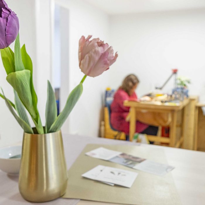 Während meiner Lehrzeit als Goldschmiedin habe ich einen grundlegenden Einblick in das Schaffen von hochwertigem Schmuck erhalten. Die Entstehung eines Schmuckstücks selbst in der Hand zu haben und dabei dem eigenen kreativen Prozess zu vertrauen, das möchte ich gerne an Interessierte weitergeben. Klicken Sie sich durch meine Kursangebote.
